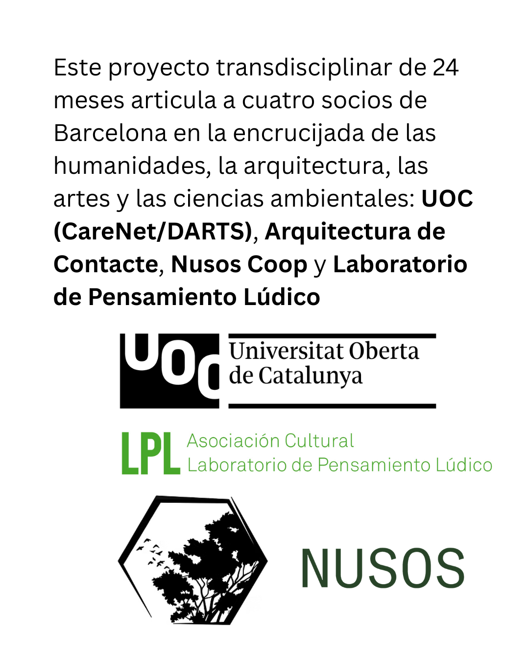 Este proyecto transdisciplinar de 24 meses articula a cuatro socios de la ciudad de Barcelona en la encrucijada de las humanidades, la arquitectura, las artes y las ciencias ambientales: los grupos CareNet y DARTS de la Universitat Oberta de Catalunya, el colectivo Arquitectura de Contacte, las ambientólogas y divulgadoras científicas de Nusos Coop y los artistas especulativos del Laboratorio de Pensamiento Lúdico.