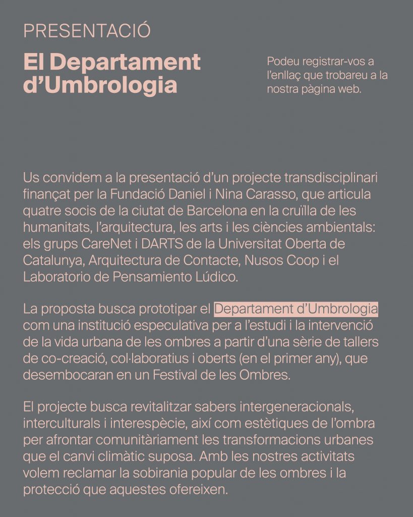 Este proyecto transdisciplinar de 24 meses (del 1 de diciembre de 2025 al 30 de noviembre de 2027) articula a cuatro socios de la ciudad de Barcelona en la encrucijada de las humanidades, la arquitectura, las artes y las ciencias ambientales: los grupos CareNet y DARTS de la Universitat Oberta de Catalunya, el colectivo Arquitectura de Contacte, las ambientólogas y divulgadoras científicas de Nusos Coop y los artistas especulativos del Laboratorio de Pensamiento Lúdico.