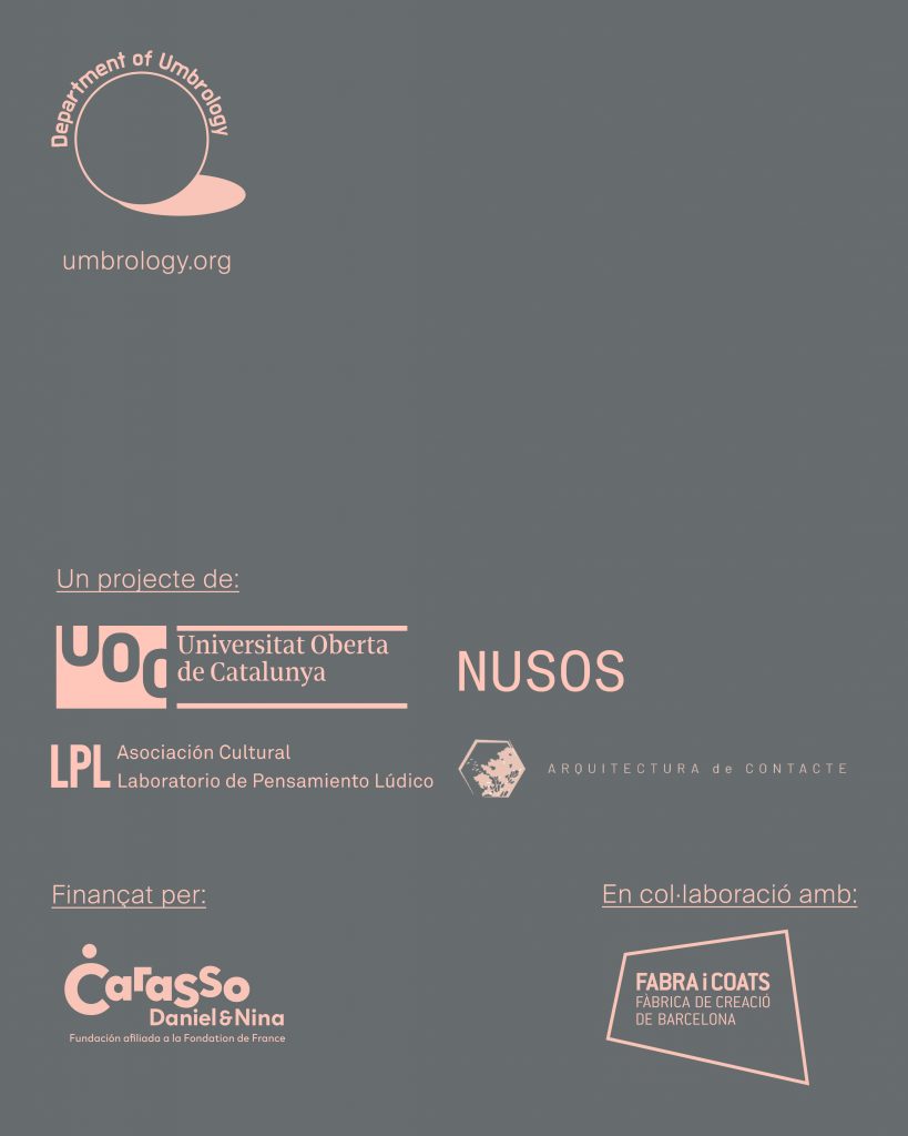 La propuesta busca prototipar el Departamento de Umbrología como una institución especulativa para el estudio y la intervención de la vida urbana de las sombras a partir de una serie de talleres de co-creación, colaborativos y abiertos, en el primer año, conducentes a un Festival de las Sombras. Así, el proyecto busca revitalizar saberes intergeneracionales, interculturales e interespecie, así como estéticas de la sombra que equipen ecologías de prácticas para afrontar comunitariamente las transformaciones urbanas que el cambio climático supone; y permitan reclamar la soberanía popular de las sombras y la protección que estas hacen posible en tiempos de mutación climática.